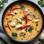 This Thai Chicken Soup is a fragrant, creamy dish that combines tender chicken breast with aromatic lemongrass, fresh ginger, and a rich coconut milk broth. Enhanced with tangy lime juice, savory fish sauce, and colorful vegetables like red bell pepper and mushrooms, this soup delivers a perfect balance of flavors and warmth, making it an ideal comfort food with a Southeast Asian twist.