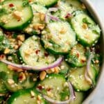 A refreshing and tangy Thai Cucumber Salad featuring crisp English cucumbers tossed with red onions, crunchy peanuts, and a zesty dressing made from rice vinegar, garlic, lime juice, and traditional Thai seasonings. Perfect as a light side dish or appetizer.