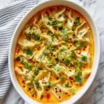 A delicious and easy Trader Joe’s Dumpling Bake featuring frozen potstickers baked in a flavorful red curry-coconut sauce, garnished with fresh cilantro, green onions, and crunchy chili onion for added texture and spice. This comforting dish combines the convenience of frozen dumplings with the rich and aromatic flavors of Thai-style curry and creamy coconut milk.