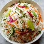 - Garnish and serve: Remove from heat and garnish with freshly chopped coriander leaves. Serve the rice with lime wedges on the side for squeezing over the dish.