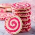 These Valentine’s Day Swirl Cookies feature a beautiful two-tone swirl design with festive sprinkles, perfect for the holiday. With a tender buttery texture and a hint of vanilla, these cookies combine classic flavors and eye-catching presentation to make a delightful treat for sharing with loved ones.