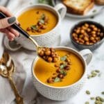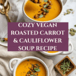 This Vegan Roasted Carrot & Cauliflower Soup is a creamy, flavorful, and nourishing plant-based soup made by roasting fresh carrots and cauliflower tossed with warming spices, then blending them with coconut milk and vegetable broth. The roasting enhances the natural sweetness and adds a subtle caramelized depth, balanced by curry powder and turmeric for an aromatic kick. It’s a wholesome, comforting soup perfect for cozy meals, topped with your favorite garnishes for extra crunch and flavor.