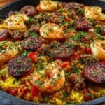 This Cajun Dirty Rice with Juicy Shrimp is a flavorful and hearty dish combining tender shrimp, savory beef sausage, and turkey bacon with aromatic vegetables and Cajun spices. Toasted rice cooked in chicken broth creates a perfectly textured base infused with the rich seasoning and proteins, delivering a classic Louisiana-inspired meal that’s both satisfying and easy to prepare on the stovetop.